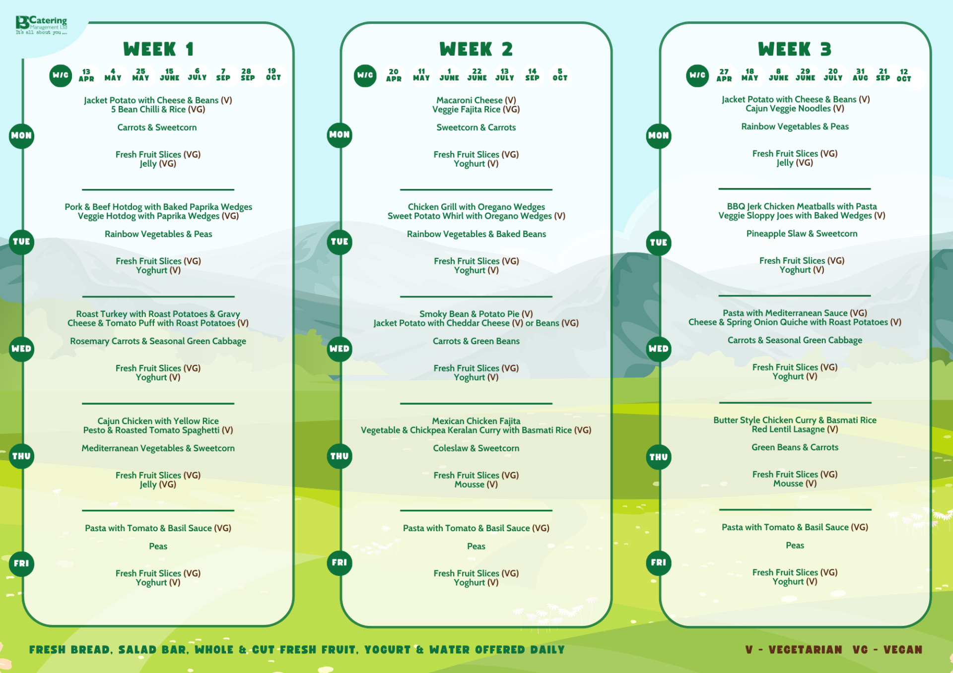 Nursery meals are served on site in nursery and are cooked fresh each day in the school kitchen. Please ensure you let the Nursery Manager know if your child has any dietary requirements.